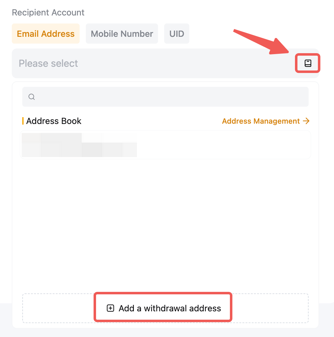 — ასევე შეგიძლიათ დაამატოთ ელექტრონული ფოსტის მისამართი, UID ან მობილური ტელეფონის ნომერი თქვენი საფულის მისამართების წიგნში დაწკაპუნებით დამატებაზე. დამატებითი ინფორმაციისთვის, გთხოვთ, იხილოთ როგორ დავამატოთ თანხის განაღდების საფულის მისამართი.