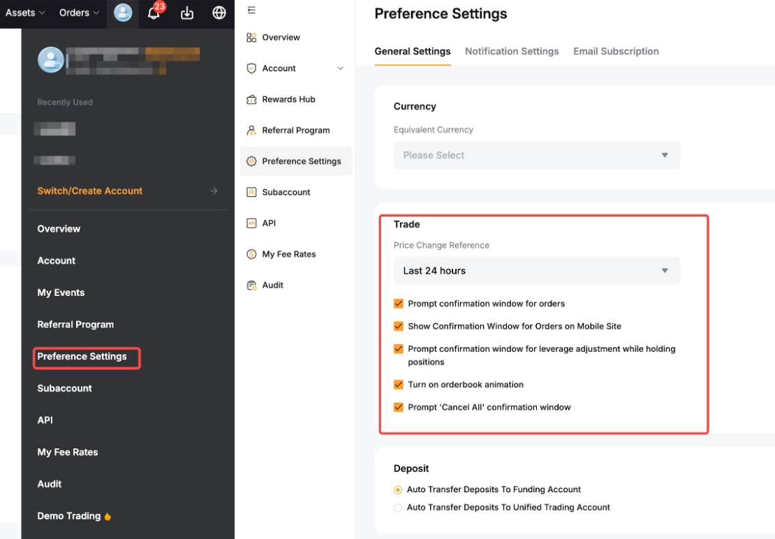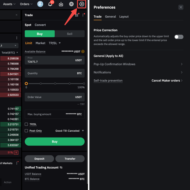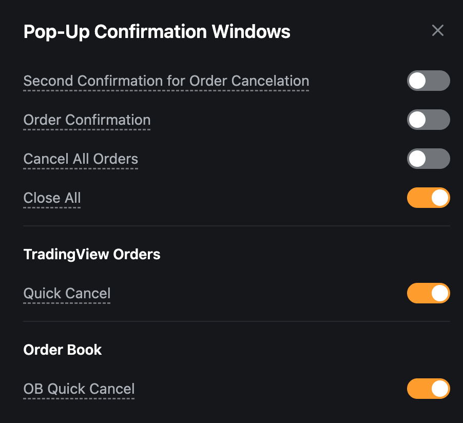 Bybit გირჩევთ, რომ არასწორი ქმედებების თავიდან ასაცილებლად ჩართული გქონდეთ მინიმუმ შეკვეთის დადასტურების, ყველაფრის დახურვის და ყველას გაუქმების დადასტურების ფანჯრები. |