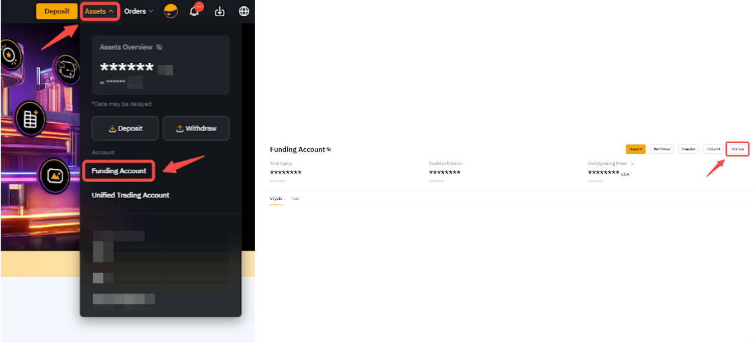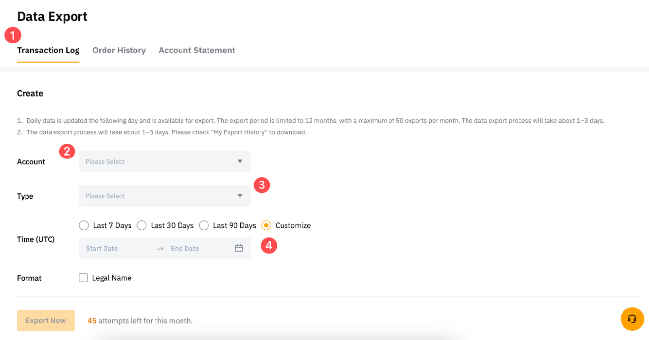 ნაბიჯი 1: გთხოვთ, დააჭიროთ აქტივებს → ფინანსირების ანგარიშს → ისტორიას → ექსპორტს ან გადადით მონაცემთა ექსპორტი-ს გვერდზე.