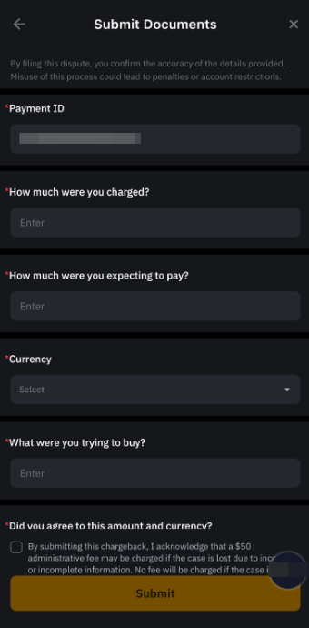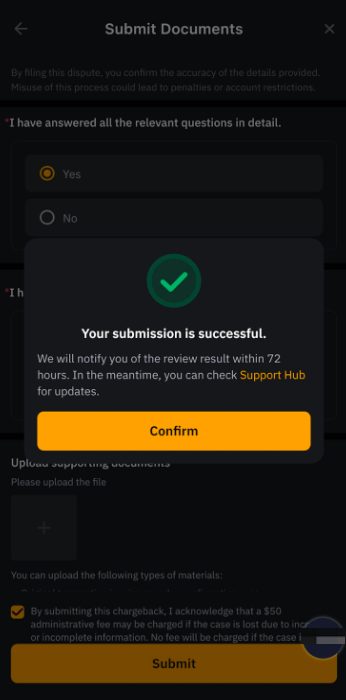 შენიშვნა: გთხოვთ, დარწმუნდეთ, რომ Bybit Georgia-სთან ოფიციალურ დავის წარდგენამდე უშუალოდ დაუკავშირდით ვაჭარს და დაელოდეთ პრობლემის გადაჭრას მინიმუმ 14 დღე.