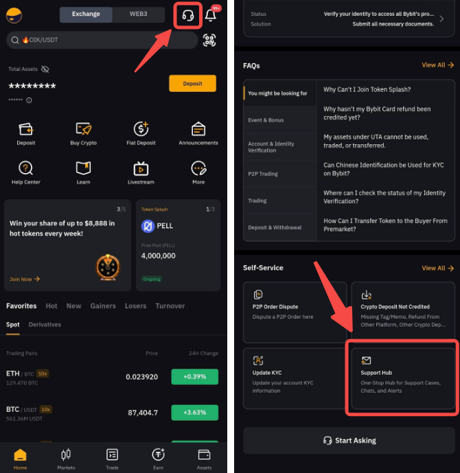 ბარათით ტრანზაქციასთან დაკავშირებული დავის სტატუსის შესამოწმებლად, შეეხეთ მხარდაჭერის ხატულას Bybit Georgia აპლიკაციის მთავარი გვერდის ზედა მარჯვენა კუთხეში. გადაახვიეთ ქვემოთ, რომ იპოვოთ დახმარების ცენტრი, სადაც შეგიძლიათ დაუკავშირდეთ თქვენს საქმეებს, თუ საჭიროა რაიმე ქმედება.