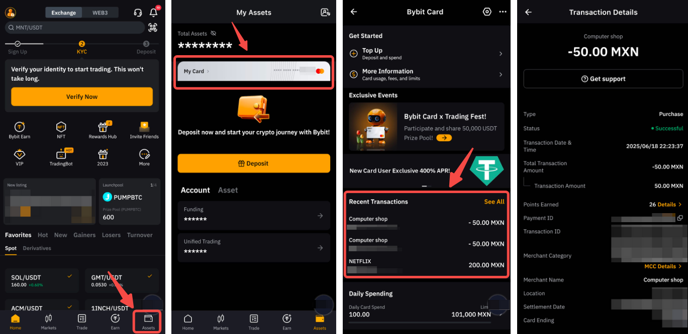 ნაბიჯი 1: შედით თქვენს Bybit Georgia აპლიკაციაში და გადადით აქტივები → ჩემი ბარათი. გადადით ქვემოთ ბოლო ტრანზაქციებზე →ტრანზაქციის დეტალები, შემდეგ შეეხეთ მხარდაჭერის მიღებას.
