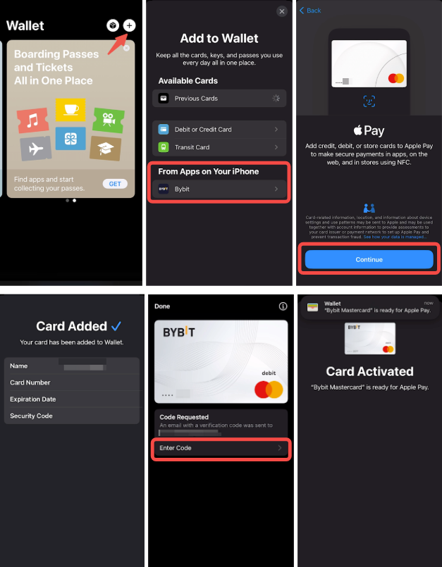 Bybit ბარათის Apple Pay-ში დასამატებლად, უბრალოდ იპოვეთ Wallet/Watch თქვენს iOS მოწყობილობაზე და დააჭირეთ ბარათის დამატების ღილაკს. შემდეგ, მიჰყევით ინსტრუქციებს თქვენი Bybit ბარათის დეტალების დასამატებლად და უსაფრთხოების დადასტურების დასასრულებლად.