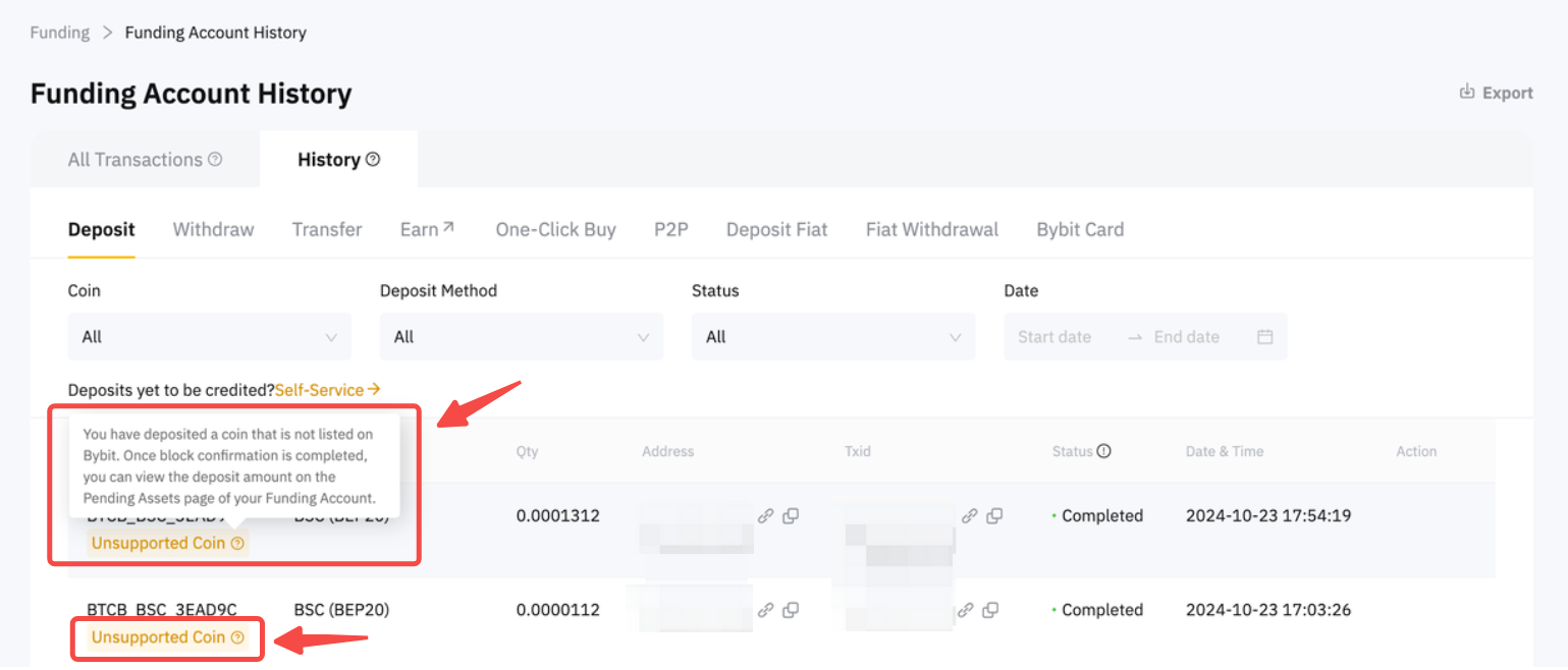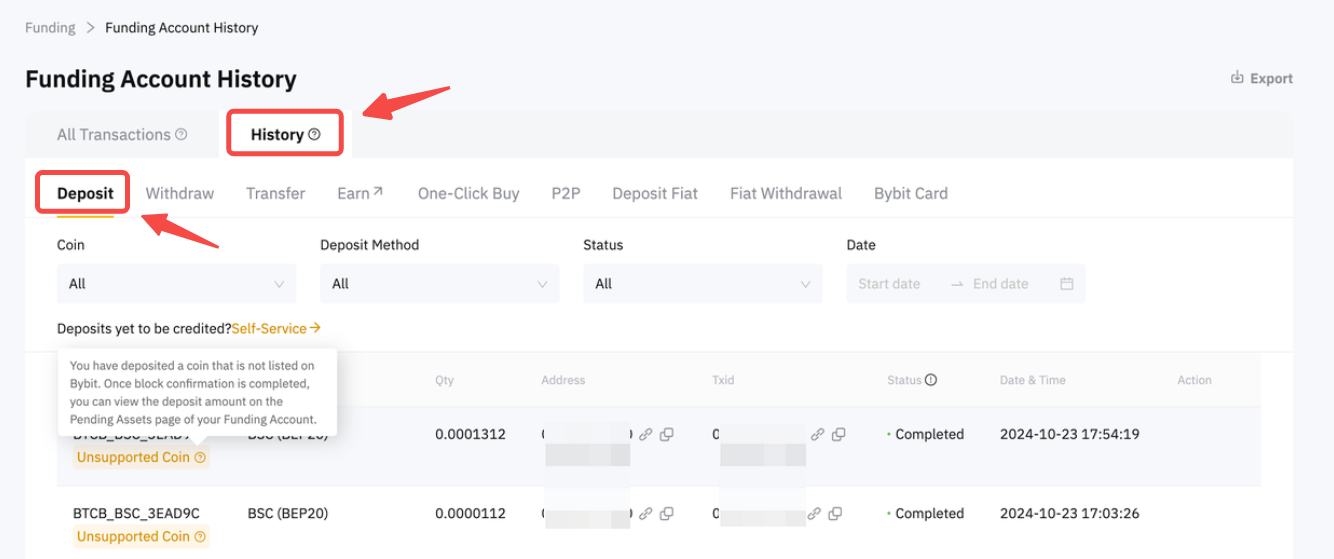 В Bybit Georgia мы уделяем особое внимание обеспечению безопасной торговой среды. Трейдеры должны проверить поддерживается ли монета и блокчейн, прежде чем вносить депозиты, во избежание потери активов неподдерживаемого депозита. Если вы внесли поддерживаемый депозит в монете, но ваши средства не поступили, следуйте этому руководству.