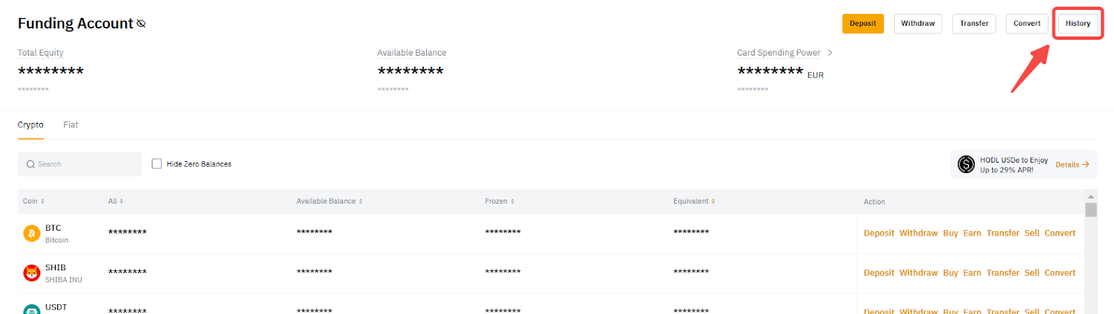 Шаг 1. Нажмите на Аккаунт финансирования → История → История → Депозит, чтобы найти историю депозитов.