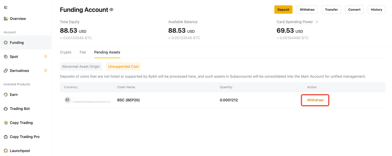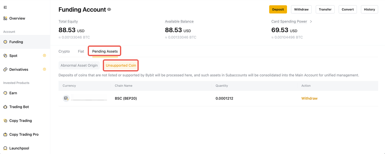 Выведите неподдерживаемые активы со страницы Активы в ожидании на внешнюю платформу/кошелёк, поддерживающий данную монету и сеть.