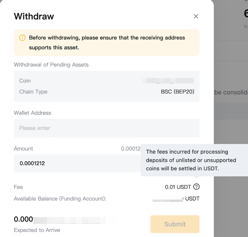 Ваш неподдерживаемый депозит не отображается на странице Активы в ожидании. Для получения активов потребуется ручная обработка. |