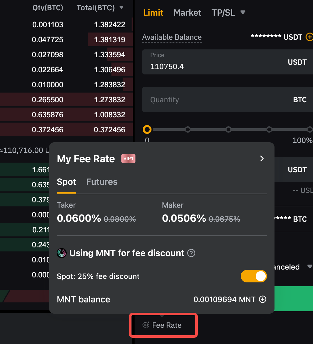 Оплата MNT доступна как для пользователей, не являющихся VIP-клиентами, так и для VIP-клиентов. Он не поддерживается для Маркеров рынка, институциональных пользователей, профессиональных пользователей или пользователей API.