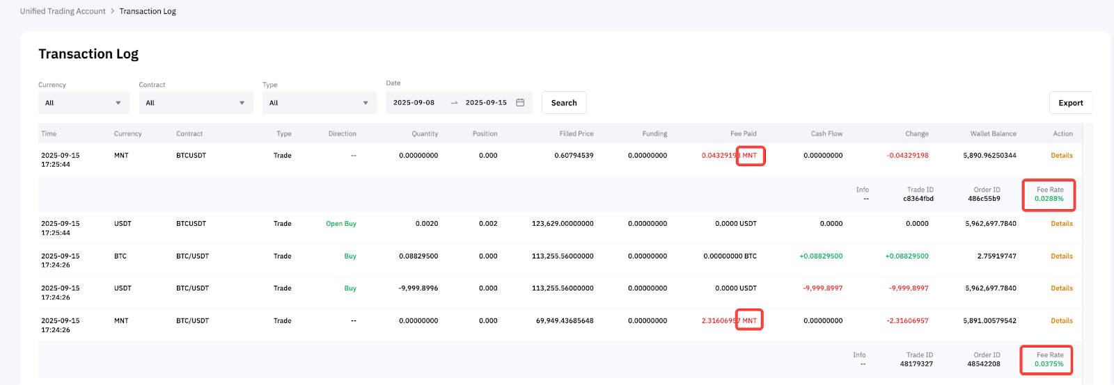 Журнал транзакций содержит подробную информацию обо всех операциях по счету. Если вы использовали MNT для получения скидки, поле «Оплаченный сбор» будет отображаться в MNT, а отображаемая ставка сбора будет отражать фактическую ставку после скидки.
