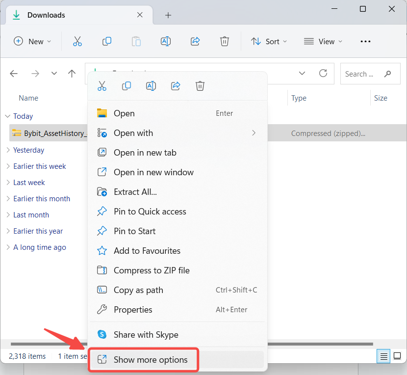 Шаг 1. Загрузите из аккаунта Bybit Georgia файл экспорта данных и откройте папку с файлом. Нажмите на файле правой кнопкой мыши и выберите «Показать дополнительные параметры» → «7-Zip» → «Открыть архив».