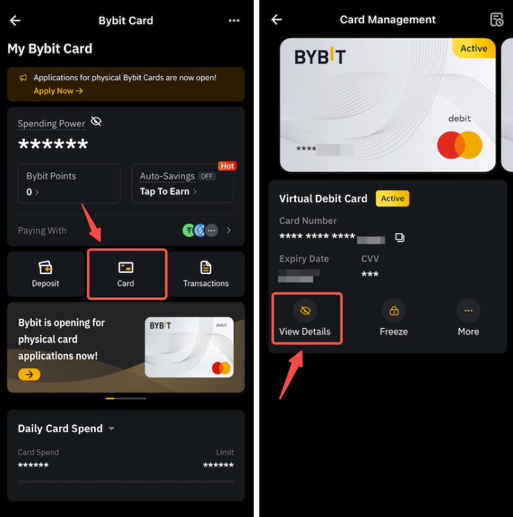 Нажмите Транзакция на странице карты Bybit. Затем можно просмотреть записи о транзакциях и авторизации.