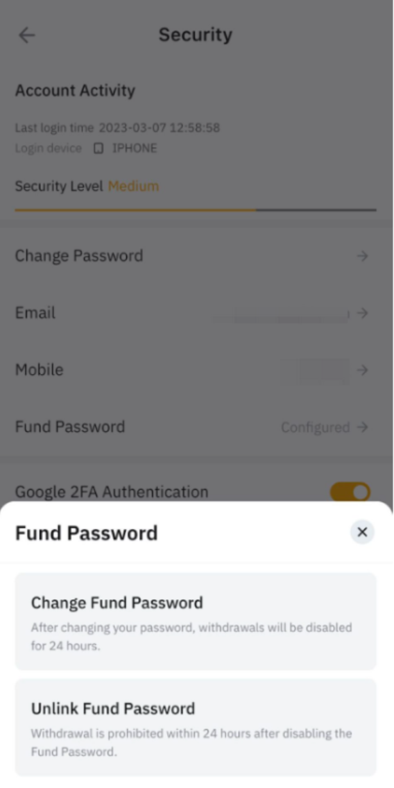 Чтобы изменить или отключить свой пароль для фонда, нажмите на Пароль для фонда и выберите Изменить или Отсоединить пароль для фонда. Обратите внимание, что вы не сможете отозвать свои активы в течение 24 часов после сброса.