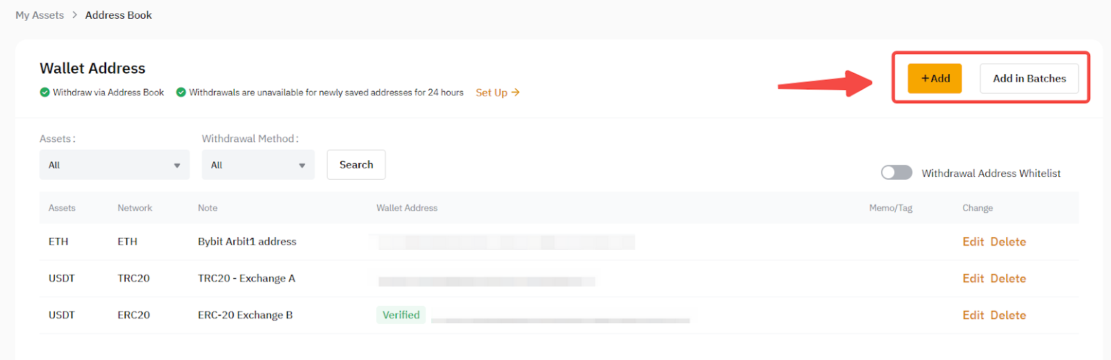 b. После перехода на страницу управления кошельком, пожалуйста, нажмите на кнопку Добавить в правом верхнем углу страницы, чтобы добавить новый адрес кошелька. Если вы хотите добавить несколько адресов одновременно, пожалуйста, нажмите Добавить в партии.