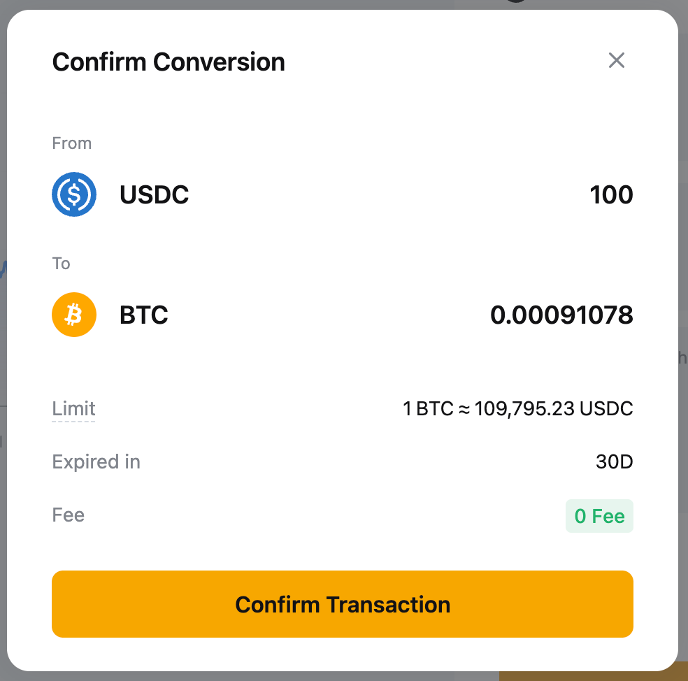 Шаг 2. На странице «Конвертация» выберите режим «Мгновенно» или «Лимит», чтобы преобразовать активы.
