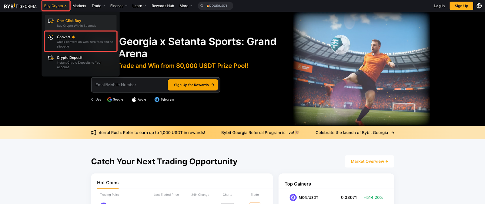 Bybit Georgia Конвертер — это простой инструмент для покупки или продажи криптовалют всего несколькими кликами без традиционных торговых комиссий. Он предлагает режимы Мгновенного и Лимитного обмена, что позволяет конвертировать активы в любую поддерживаемую криптовалюту на аккаунте Финансирования и/или Едином торговом аккаунте.