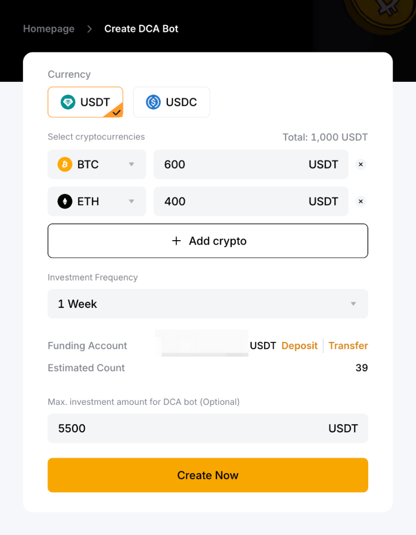 - Макс. сумма инвестиций для бота DCA (опция): 5500 USDT