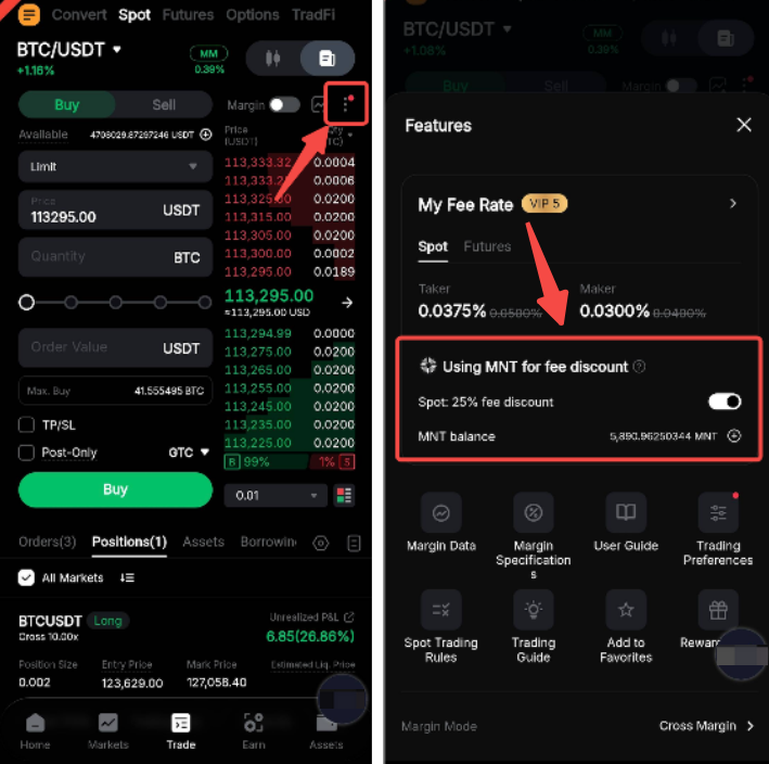 Кроме того, на торговой странице приложения нажмите на значок с тремя точками и включите опцию Использование MNT для получения скидки на комиссию.